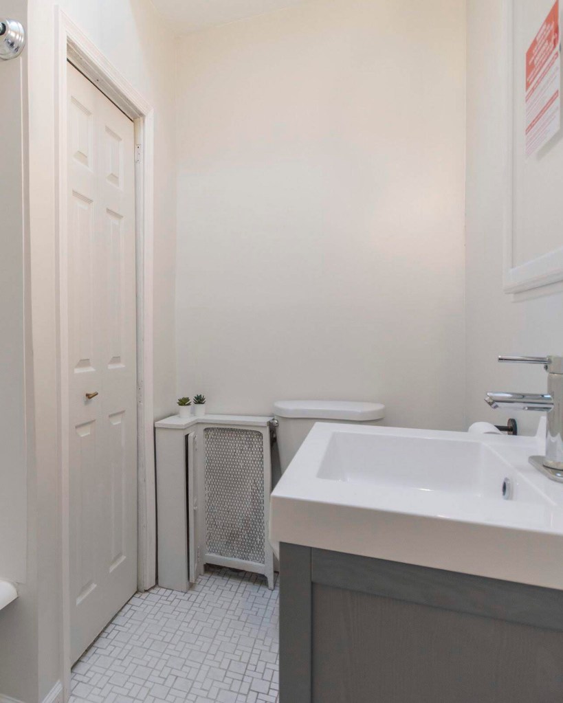 We didn’t have too much to do in the basement. It was already mostly finishes, but needed a big refresh. The biggest change was in the bathroom. We replaced the vanity for an Ikea vanity, painted, replaced the mirror and light fixtures, and also replaced the flooring with a stick on vinyl tile floor.