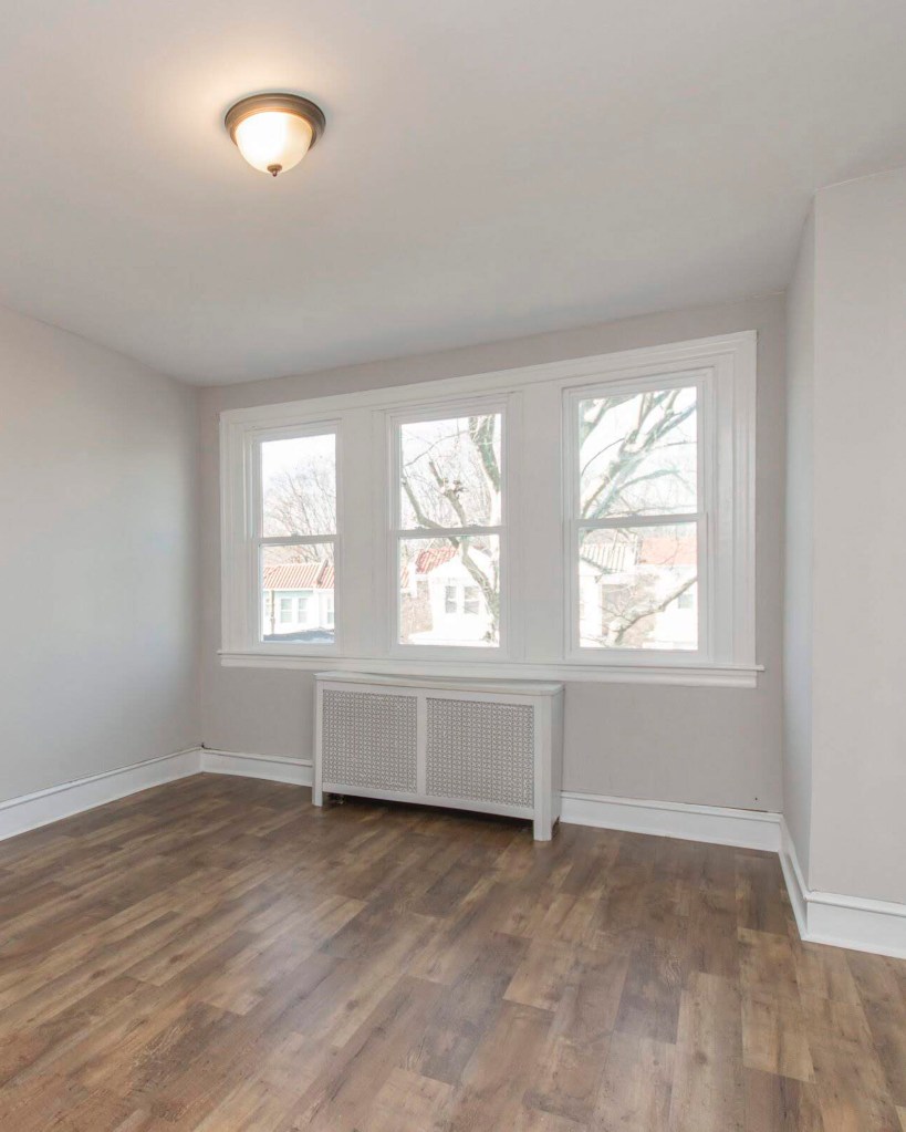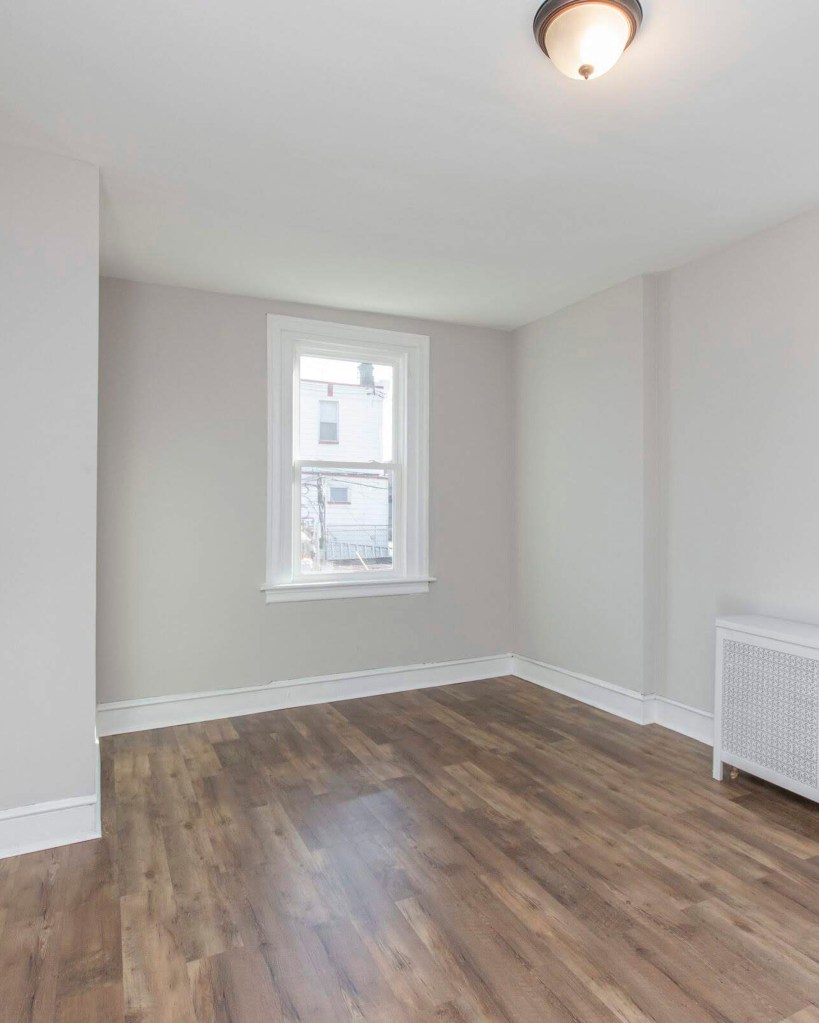 The first floor showed SO much POTENTIAL and character!! It had this big beautiful sun porch with a cute little doorway with windows. I love when I find old woodwork detail in these houses and try to keep that in tact as much as possible. I also fell in love with the floors. The house had original hardwood hiding underneath a carpet and in some rooms I could see a really cool inlay. Unfortunately when I removed all the carpeting there were too many sections of the floor that were patched in with plywood, stained and really unsalvageable. It was not worth me trying to repair them when I was using it as a rental, so I *sigh* covered it with Luxury Vinyl Tile (LVT).
