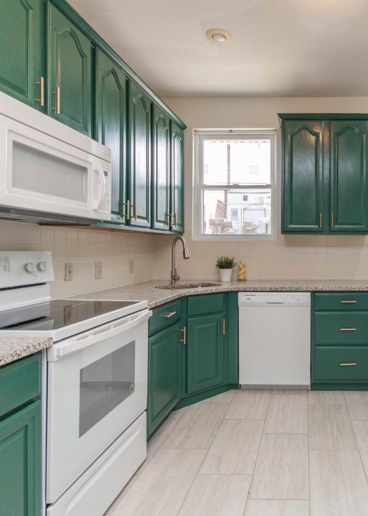 The most drastic changes came from just cleaning the house up, painting everything neutral colors but adding a pop of color in the kitchen. It was a risk, but it ended up being totally worth it! I used Westminster Green chalk paint by General Finishes and swapped out the old door handles for these brushed brass ones.