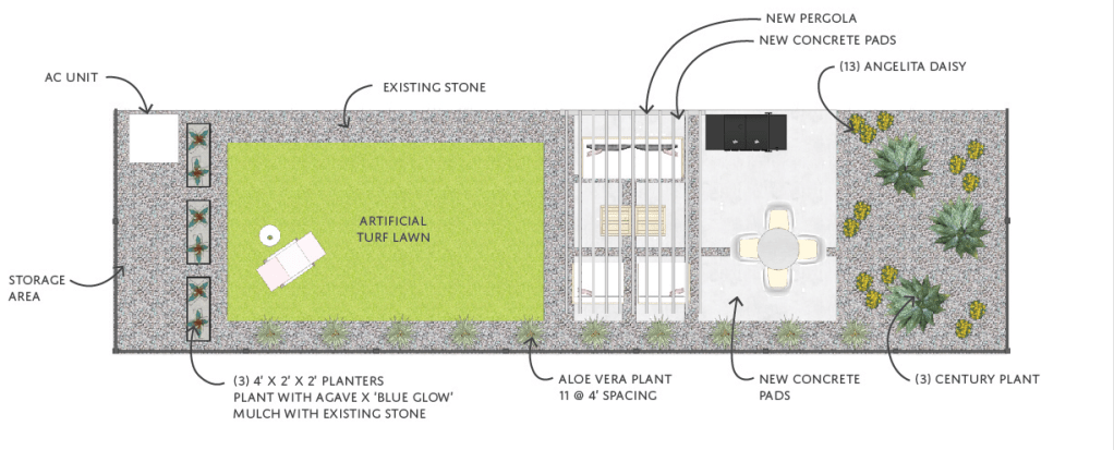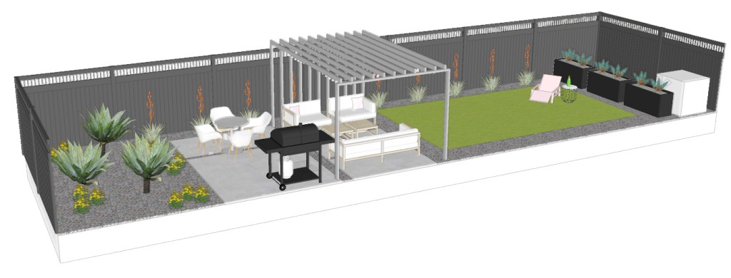 This week I tackled a different kind of project; I drew plans to update a backyard in Las Vegas! The backyard is for a friend of my brother’s. She has a 14′ x 55′ rectangular backyard in the lower desert region of Las Vegas.