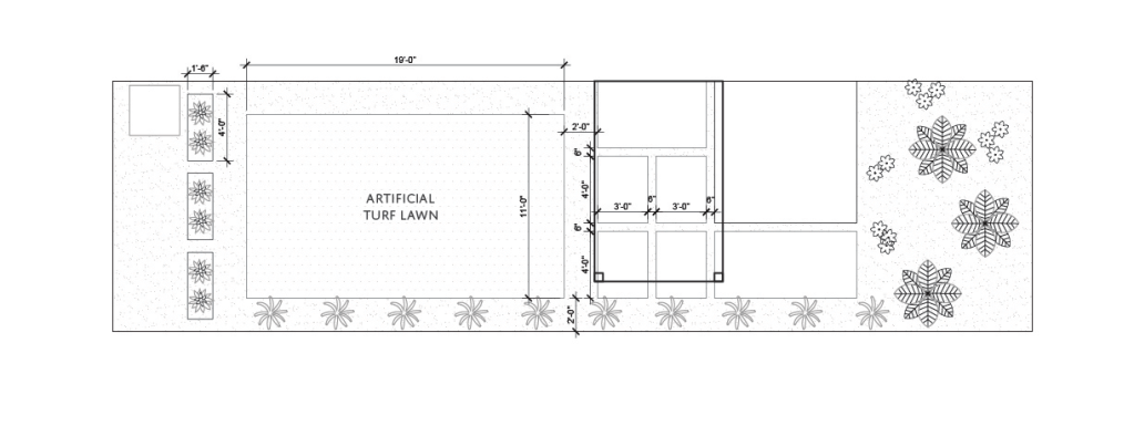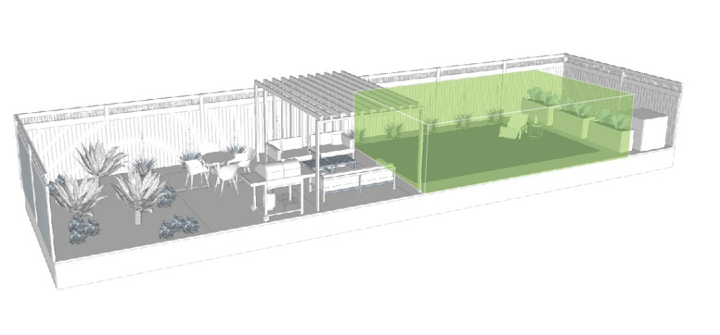 Finally, the largest zone is the artificial turf lawn area. The lawn is bordered with the existing gravel and takes up the most space. The owner has a small dog that would love to play around in grass and this is the perfect low maintenance solution to achieve that goal.