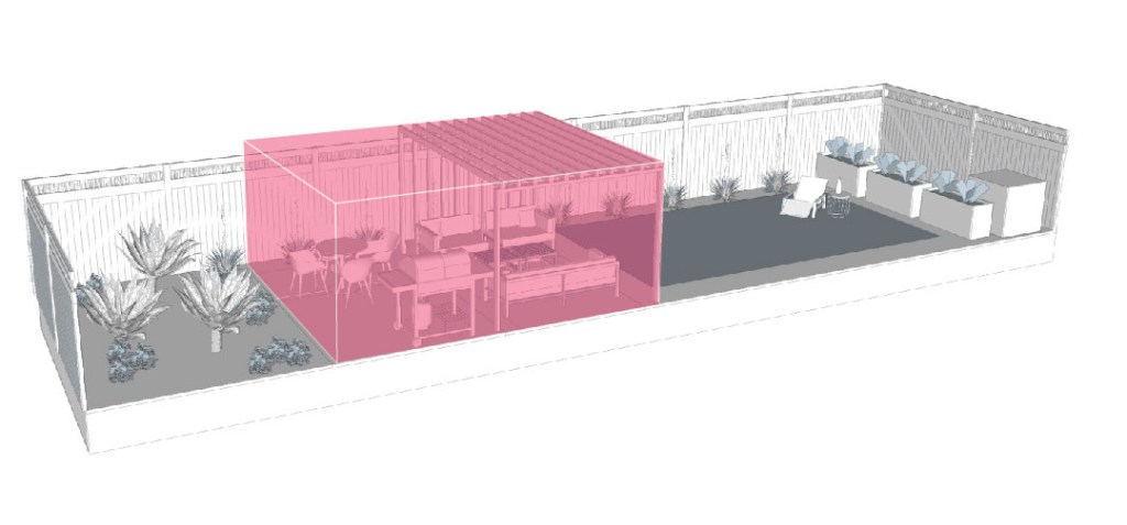 The existing house has a small concrete patio currently big enough to squeeze a grill, a couch and a couple chairs. The goal was to extend the concrete pad in order to allow room for a shade awning. The grill had to stay where it was since it’s connected to a natural gas line. The concrete slab around the patio almost doubled in size allowing a pergola to take over the additional patio space. This allowed the grill stay where it is and remain outside from underneath the pergola. A small dining area takes up another corner of the patio.