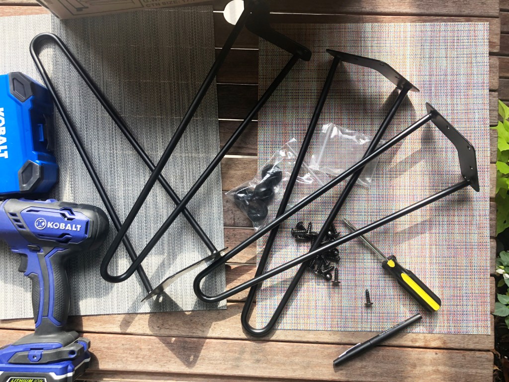 Once you have all your holes drilled in place, attach your legs using the provided hardware. My package came with five screws per leg, but I only used three per leg because the wood was so difficult to drill through and I really didn’t need any more to support the weight of the planter. I’ll hold onto these extra screws just in case I may need them for a future project. My hairpin legs came with little round feet, so I attached these at the base of the legs to help keep them grounded.