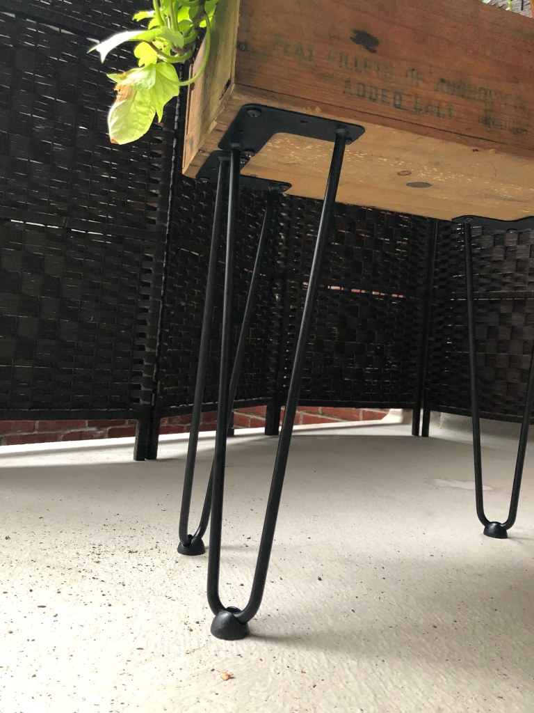In order for it to stand a little taller I purchased these hairpin legs from amazon and screwed them into the bottom. I love the way it looks and it turned out to be the perfect height to really frame the seating space we have!