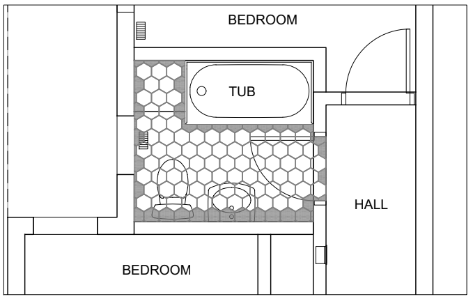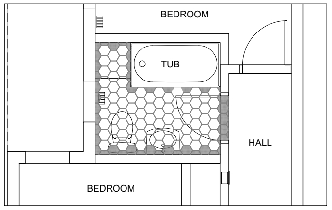 Last week I shared on my stories some plans I had for the tile work in the bathroom. I picked a hexagon tile and I tested out two different layouts on the floor to see which one looked the best and more importantly had the least amount of cuts involved. Reducing the number of cuts both reduces the amount of time required for my contractor, but also reduces the amount of uneven jagged edges that may result from field cutting. I shaded in grey which tiles would have to get cut in the below examples.