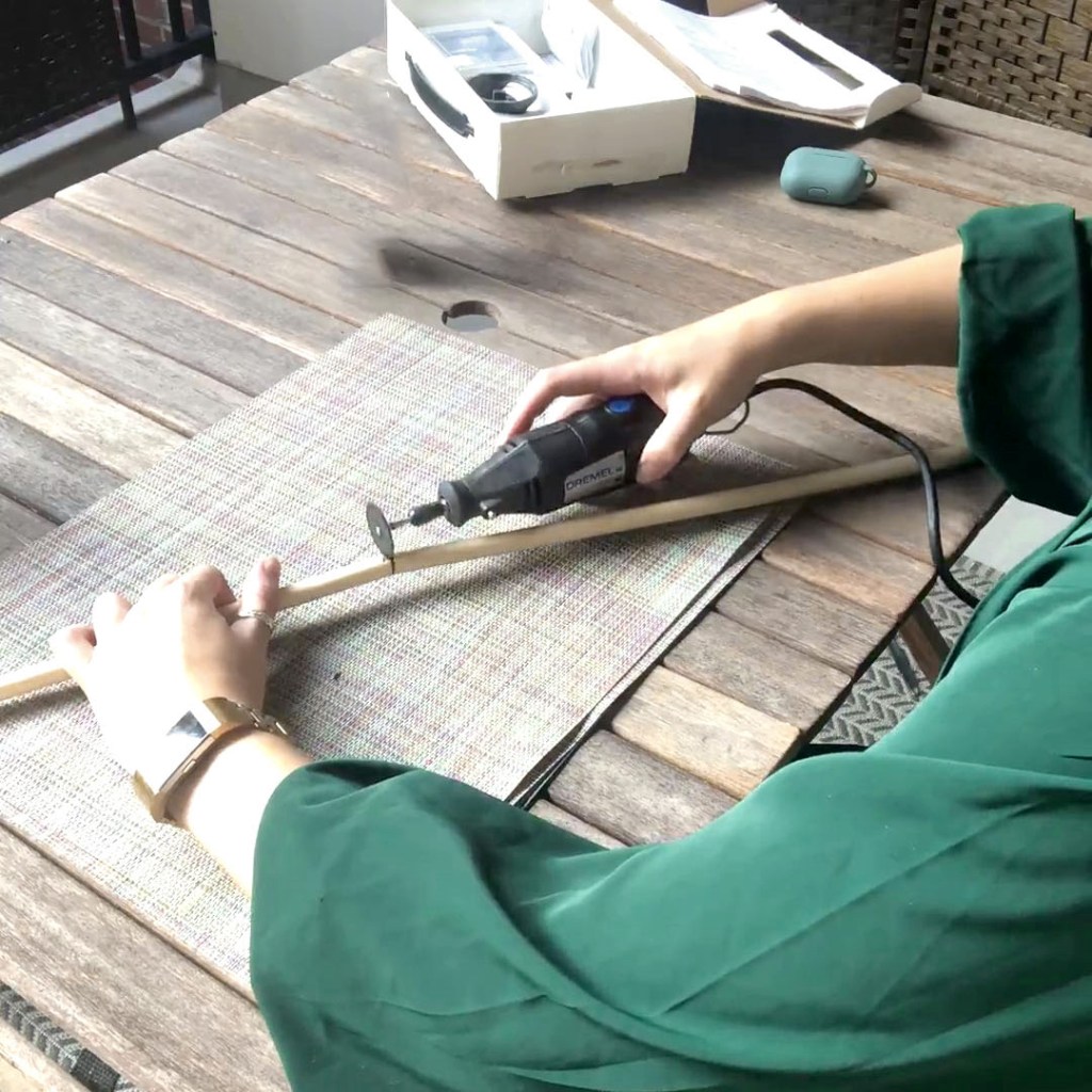 Once you have the flower glued to the rug, time to attach the dowel to the top. Cut your dowel anywhere from 26 inches to 30 inches in length depending on how much to stick out the sides. I used a dremel, but you can use a saw or you can cut it at Home Depot. With your rug folded, place your dowel in the back of the fold. Using thread, stitch the fabric around the dowel. Cut back the excess of the rug.