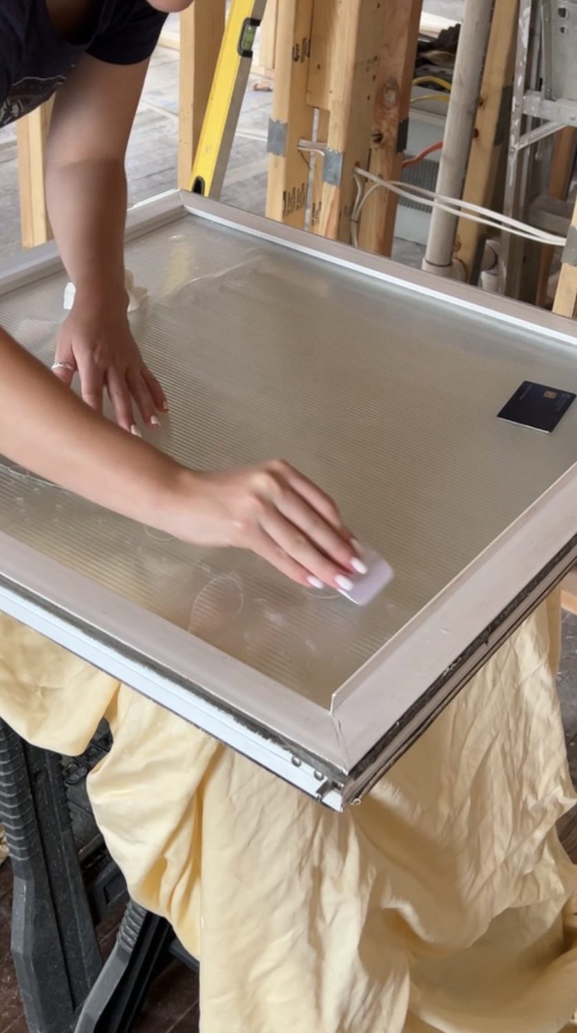 Once your film is trimmed use a squeegee to push the air bubbles and water to the edge of the film. I didn’t have a squeegee, so I used my Chase Sapphire card which worked great. Use a paper towel to soak up the water from the edges. If you’re having trouble getting air bubbles out you can still lift the privacy film and reset it!