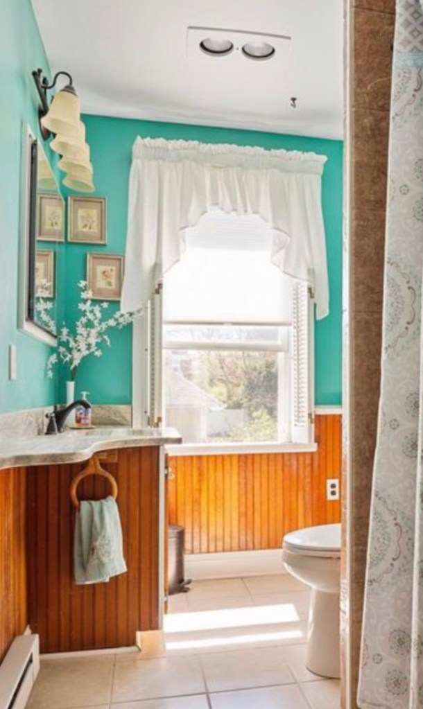 The only room that was recently renovated in our house was the upstairs bathroom. It had a questionable paint choice and some outdated details we had to touch up, but ultimately was the easiest place to put a little bit of energy to get finished. The walls were painted teal blue, the light fixtures were outdated and the window coverings were very grandma chic.