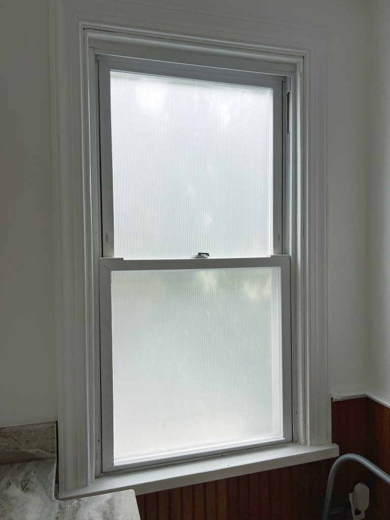 We bought this Frosted Reeded Glass Privacy Film on Amazon. It was extremely easy to install, allows much more light into the bathroom, easier access to open and close the window, and a cleaner look overall.