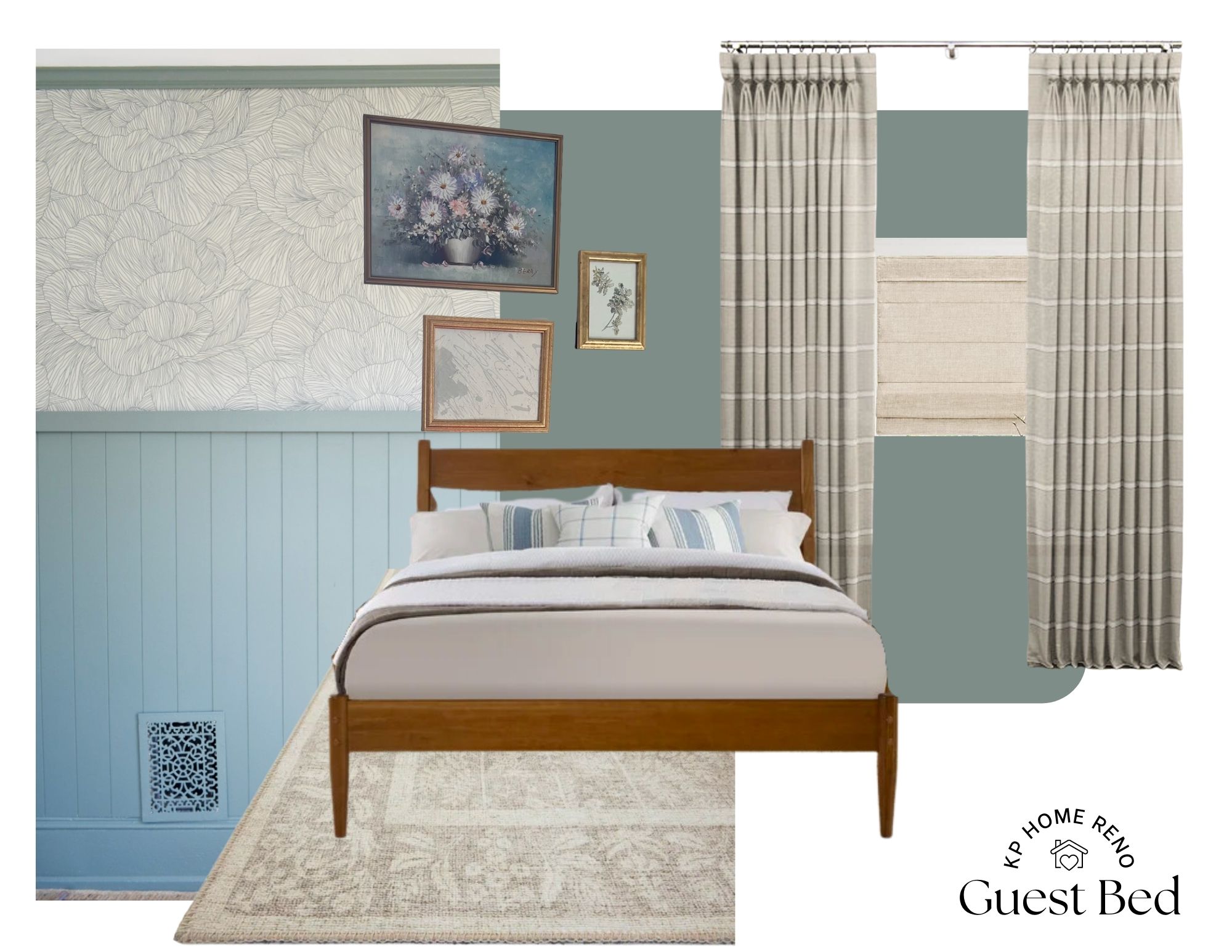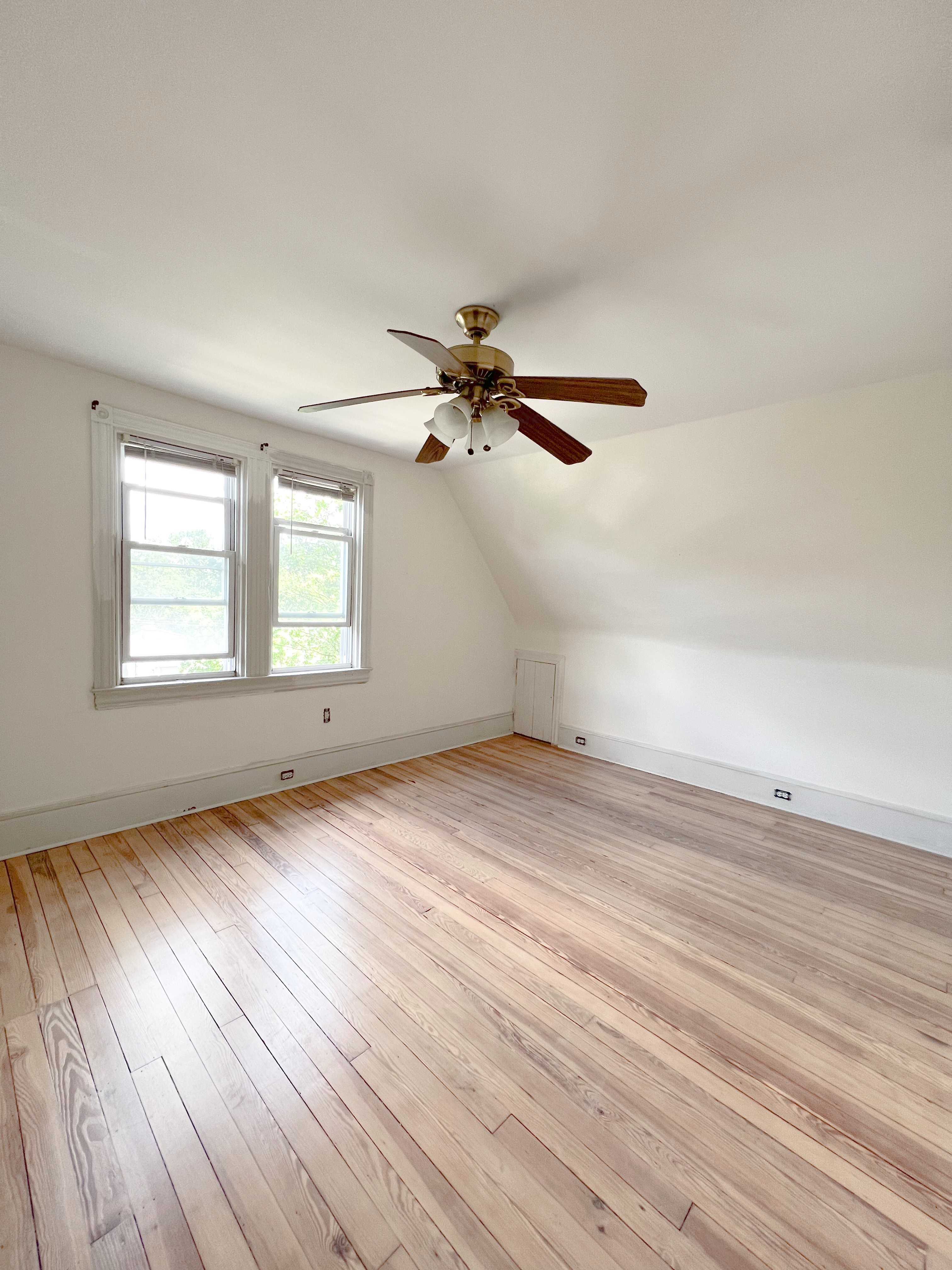 We upgraded our upstairs flooring by removing the carpet and refinishing the existing hardwood floors. We also painted the walls using leftover paint from our Pearl House renovation. Using leftover paint from a previous project, we painted the walls in Swiss Coffee by BEHR and the trim in Toasty Gray by BEHR.