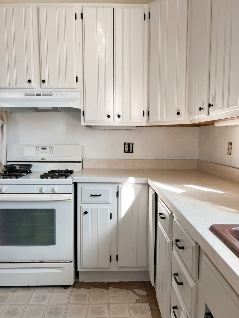 We recently painted the kitchen cabinets to brighten up the space and could not be more in love with the outcome. We desperately need to paint the walls since we removed the wallpaper. Since our living room has been a wreck, we have been using the kitchen to house our dining room table and the room isn’t big enough for it.