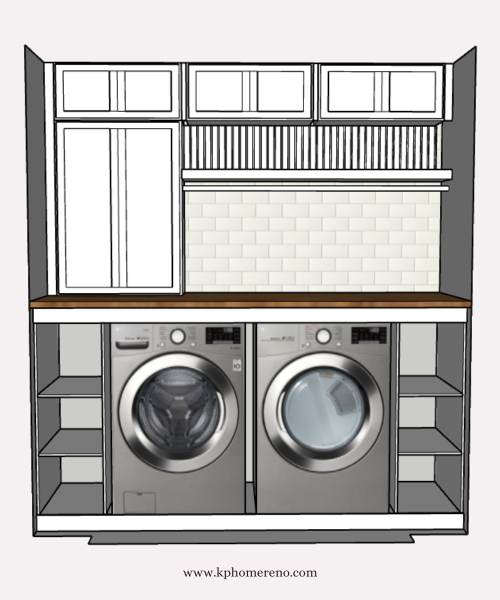 Countless iterations later, we found ourselves settled on a design and layout that not only met our laundry dreams but also mirrored the style we adore. The washer and dryer stood side by side, crowned by a countertop that gracefully stretched across the room. To the left, a chic cabinet held court, topped by three equally stylish companions.