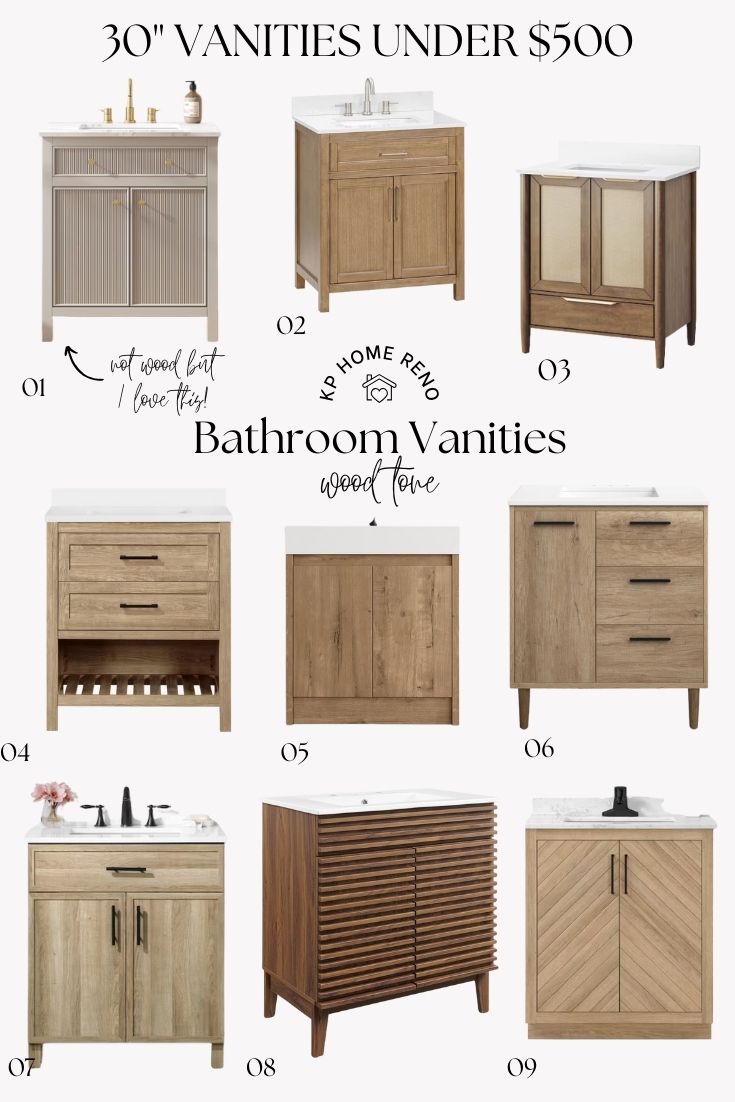 LINKS: 1. Allen and Roth Sandbanks ($399.00) 2. Allen and Roth Connery Warm Oak ($499.00) 3. Origin Westmoreland ($499.00) 4. Home Decorator Collection Autumn ($379.00) 5. 30″ Brown Floorstanding Vanity Set ($385.00) 6. Burnam Single Vanity with Engineered Top ($419.96) 7. Style Selection Dolton Natural Oak ($349.00) 8. Modway Render Vanity ($348.35) 9. Huckleberry in Weathered Tan ($349.00)